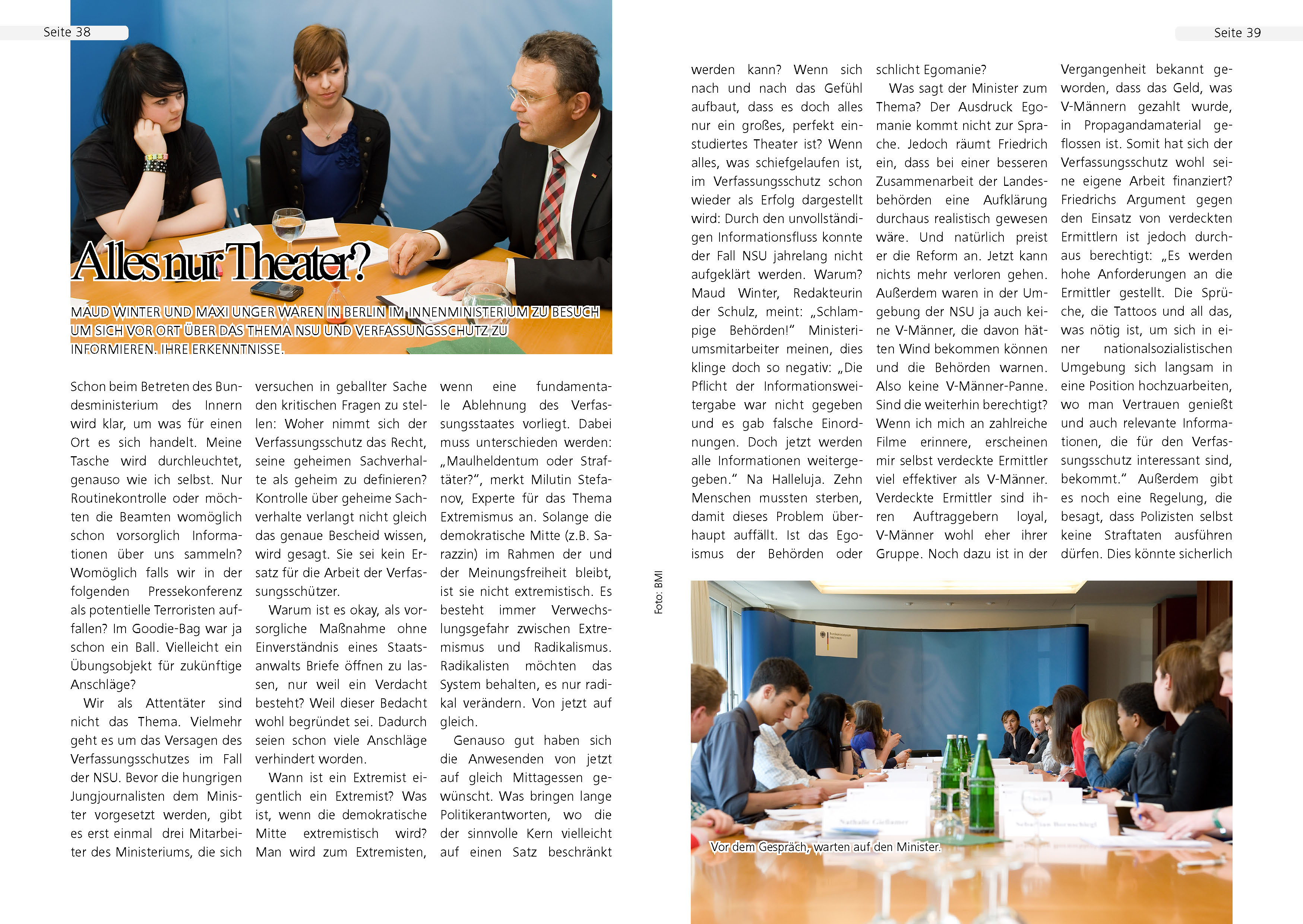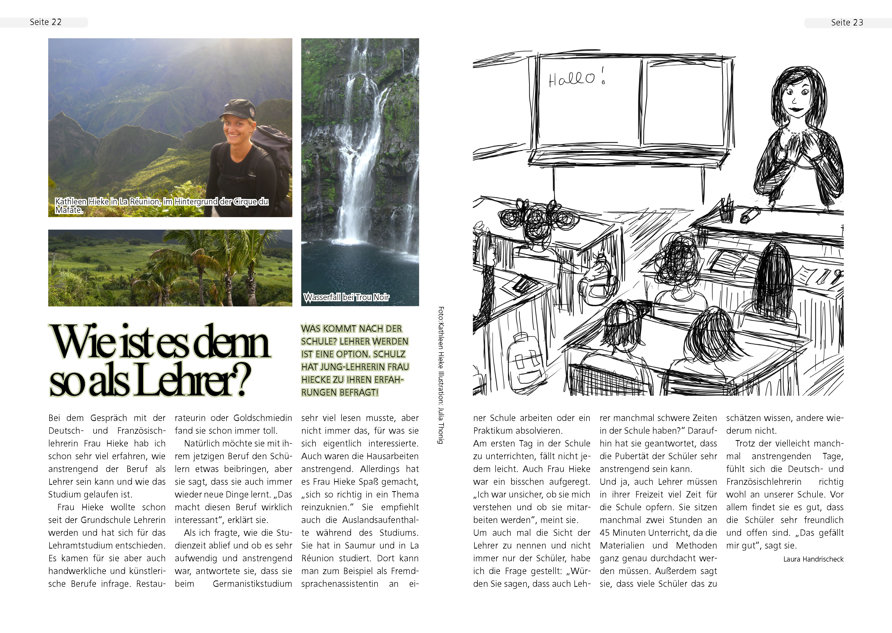 es ist wieder soweit, ihr haltet die neu Schülerzeitung in der Hand. Und bald schon sind Sommerferien und wieder ein Schuljahr für jeden von uns vorüber. Aber jeder von uns wird auch neue Erfahrungen, spannende Erlebnisse und auch Rückschläge aus diesem Schuljahr mit in seine Sommerferien nehmen und auch mit ins Leben. Ich habe mittlerweile beinahe mein 11. Schuljahr beendet und schaue auch gerne zurück auf meine Schulzeit. Und wenn ich zurückdenke, dann merke ich auch, wie schnell die Zeit vergangen ist. Und nächstes Jahr werde ich Abitur schreiben, aber was dann? Eine interessante Frage stimmt‘s? Die Frage nach dem „Danach“ stellt sich doch jeder einmal. Aber nicht nur „was kommt nach meiner Schulzeit?“ sondern auch noch viele andere „danach“ Fragen. Ihr ahnt sicherlich bereits, was demnach das Thema der jetzigen Ausgabe ist. Richtig, „Was kommt danach?“. Wir haben mit Menschen geredet, über das, was sie nach ihrer Schulzeit gemacht haben oder auch die Geschichte des Männerbildes genauer betrachtet. Natürlich gibt es auch in dieser Ausgabe Schulnews, Rätsel und Lehrerzitate neben unserem neuen Specialthema.
